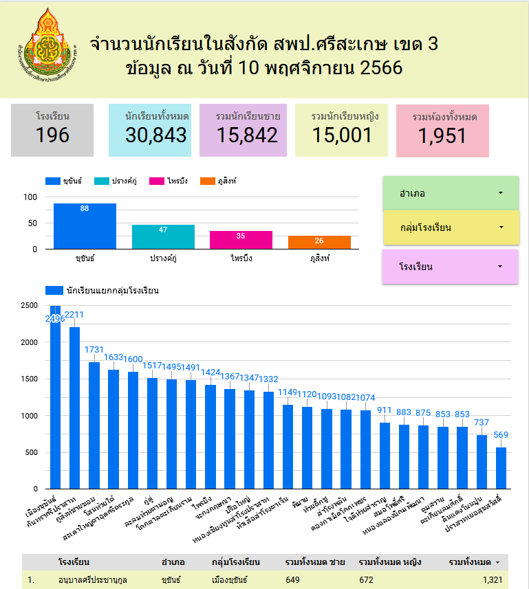 จำนวนนักเรียนในสังกัด สพป.ศรีสะเกษ เขต 3 ข้อมูล ณ วันที่ 10 พฤศจิกายน 2566 กุมภาพันธ์ 29, 2024 Last updated : กุมภาพันธ์ 29, 2024 admin ยอดผู้เข้าชม : 1,555